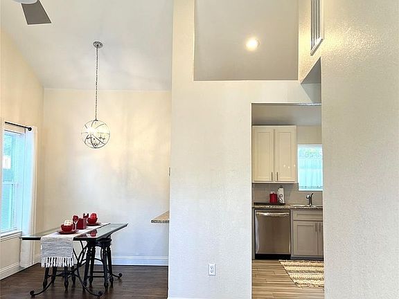 Adorable SW Fort Worth cottage features vaulted and loft ceilings in open living, dining and kitchen areas? Freshly painted in designer colors. Three nice size bedrooms, one bath, one car garage and carport conveniently located to Southwest Blvd. Recessed and decorative lighting, original refinished wood floors, recently installed refrigerator with ice maker, dishwasher, custom cabinetry in kitchen and utility room. Granite countertops, subway tile backsplash. Tile area and kitchen. Bathroom has updated tile, vanity, shower and tub. Ceiling fans with light kits in all bedrooms, dining and living areas. Spacious utility room opens to a nice size raised backyard wood deck trimmed with white fencing. Sidewalk leads to carport and garage. Updated HVAC, windows and window treatments, curtains and hardware. Yard maintenance included. Landscaped front and backyard. Measurements are approximate. Owner has final approval on all applications and pets. No cats.