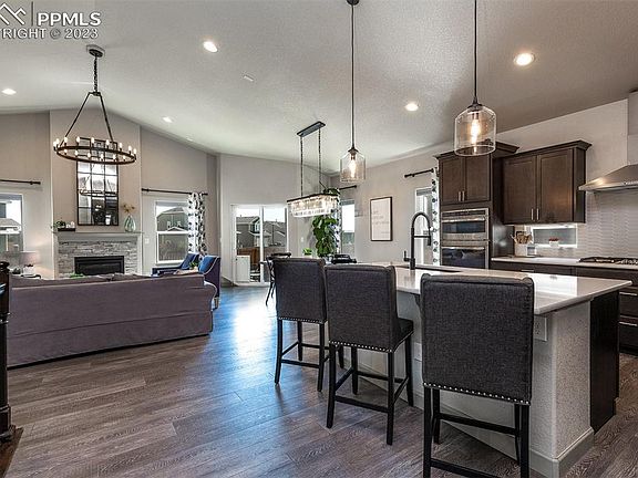 Stunning Ranch Style home on a corner lot with a 950 sq ft attached 5 CAR GARAGE! This home features 5 bedrooms, 3 bathrooms, LTV flooring through-out most of the main level and basement, central air, vaulted ceilings, and a gas fireplace! This kitchen is a chef's dream with Quartz counters, a 5 burner gas cook-top, plus a wine fridge. From your spacious master bedroom, walk through a beautiful barn door to an amazing master bathroom which features a 5-piece master bath plus a spacious walk-in closet. The basement area offers an additional family room space great for entertaining plus 3 additional bedrooms. This corner lot is immaculately landscaped and includes a storage shed. You'll never have to hang holiday lights again! This home is fully equipped with Rocky Mountain Trim lighting! Just minutes from FT. Carson, Peterson AFB, and I-25. This is a must see!