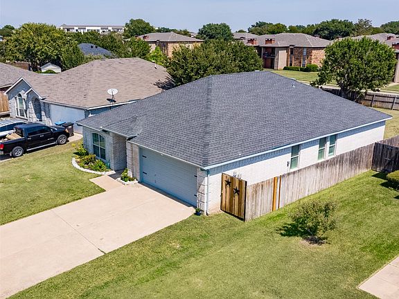 Located in the desirable Trail Lake Estates subdivision of Fort Worth, this beautiful, move-in ready 4-bedroom, 2-bathroom home offers 1,854 sq ft of comfortable living space on a spacious 9,148 sq ft lot. Built in 2003 and nestled in a quiet cul-de-sac, the property features inviting curb appeal with St. Augustine grass and flower beds lining the entrance. The slab foundation supports a well-maintained single-story layout with large windows in the family, dining, and living rooms that fill the home with natural light. The family room centers around a ceramic tile wood-burning fireplace and hearth. The roomy primary suite includes a large walk-in closet, and all bedrooms offer walk-in closets. The kitchen features a spacious pantry, and the oversized laundry room includes cabinets, shelving, and extra space for utility storage. Stylish new grey drapes add a modern touch throughout. The grassy backyard is a peaceful retreat with mature trees including an Arizona Ash, peach tree, and crepe myrtle, plus vibrant flower beds. The home is all-electric and not plumbed for gas. The roof and water heater are approximately 5 years old, and the HVAC system has been serviced annually, with the most recent service completed. Termite prevention was professionally done in late spring. Conveniently located near major highways including I-35W and Loop 820, residents enjoy easy access to shopping, dining, and recreational spots like nearby lakes and parks. This home blends comfort, charm, and location. This well-maintained home is ideal for a first-time buyer seeking comfort and peace of mind.