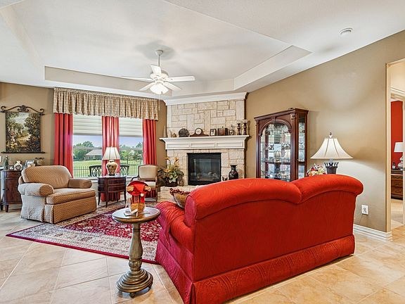 Welcome to resort-style active adult living in the highly sought-after Frisco Lakes by Del Webb Golf Course Community! This beautifully maintained single-story home backs to lush golf course views. From the inviting curb appeal with mature trees to the covered front porch, this residence blends warmth and elegance inside and out. Step into a spacious open-concept living area highlighted by a cozy stone fireplace, tray ceiling, and walls of windows showcasing serene backyard scenery. The chef’s kitchen features rich wood cabinetry, granite counters, a gas cooktop, stainless steel appliances, and a breakfast bar that flows seamlessly into the dining and living spaces—perfect for entertaining. The private primary suite offers a sitting area with bay windows overlooking the course, a tray ceiling detail, and a luxurious en-suite bath complete with dual sinks, soaking tub, walk-in shower, and ample storage. Secondary bedroom and an additional living area or study provide flexible space for guests, hobbies, or work-from-home needs. Outdoors, enjoy relaxing under the covered patio with ceiling fan while taking in sweeping views of the fairway. The low-maintenance stone patio and iron fencing make this backyard retreat both functional and picturesque. Frisco Lakes by Del Webb offers a rich array of amenities designed for the active adult lifestyle, including: 18-hole championship golf course,Pickleball and tennis courts,Indoor and outdoor pools State-of-the-art fitness center,Clubhouse with year-round events and activities.