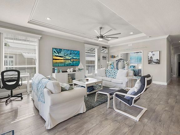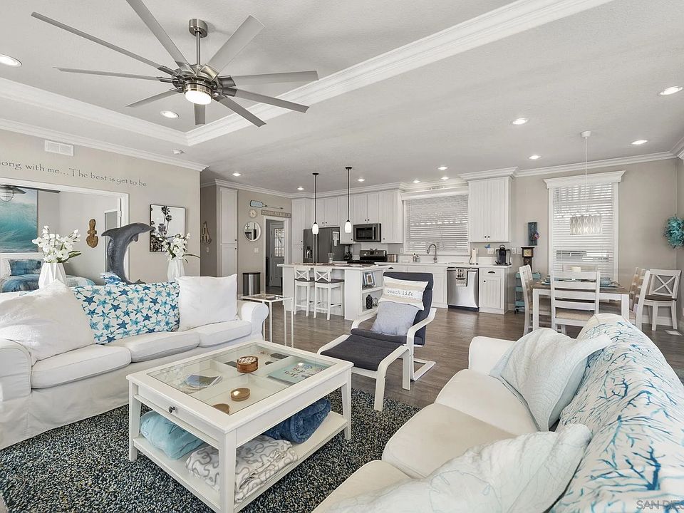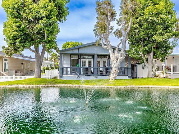Welcome to paradise with a stunning lake and greenbelt view! Built in 2016, this is a beautifully maintained three bedroom, two bath manufactured home located in the highly desirable 55+ gated community of Lakeshore Gardens in Carlsbad. A meticulous masterpiece featuring a panoramic view of the greenbelt and lake with a full-length deck across the rear of the home. Furnishings throughout are included with the sale! Expansive dual pane windows and double patio doors filling the living and kitchen with natural light. Bright and open floor plan with vaulted ceilings. Spacious open living and dining areas flow into a well-designed kitchen featuring stainless steel appliances, plenty of cabinetry and counter space with an extended island for all your cooking and entertaining needs. Upgraded ceiling fans located throughout the home. Combination air conditioning and heating unit. Primary suite provides a private retreat with ample closet space and main bathroom with a gorgeous tiled shower. An additional bedroom off of the living room has double doors and is perfect for guests, hobbies, or even a home office. Step outside to a large covered deck and low-maintenance yard with artificial turf—ideal for morning coffee, ocean breezes, or gathering with friends. Lakeshore Gardens is one of Carlsbad’s most sought-after 55+ communities offering resort-style amenities including a clubhouse, heated pool, spa, fitness center, and beautifully landscaped walking paths. Plus, coast highway and the beach is just a distance away! Minutes from shopping, dining, and everyday conveniences, this home offers the ideal blend of comfort and lifestyle!