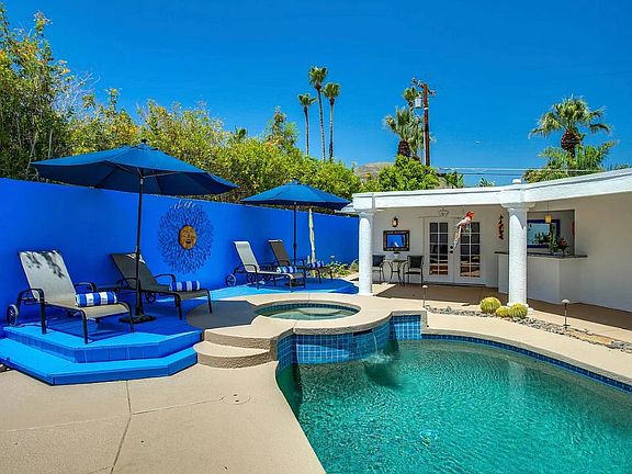 European villa inspired compound met with solace and tranquility. Five minute walk to restaurants, shopping and media district on El Paseo. This Palm Spring's/Indian Wells adjacent luxury home features 3 bedrooms, 3 full bathrooms, pool, hot tub, spacious yard, making it perfect for a family to live long term, host events, reunions or if you're visiting for the weekend. An awesome set up for up to 8 guests! The house also boasts a full kitchen, outdoor BBQ and bar!