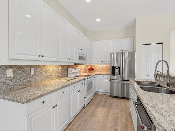 This Granville model in Cascades has been beautifully transformed with BRAND NEW Nature Tek laminate flooring installed throughout the home, offering a seamless and elegant look that enhances every room. With 2 bedrooms plus a den, 2 bathrooms, and over 2,000 square feet of living space, this residence sits on a larger lot with an extended side yard. Freshly painted in neutral Sherwin-Williams tones with wallpaper thoughtfully removed, the interiors are ready for your personal touch. The spacious kitchen offers white 42'' cabinetry, sleek granite countertops, stainless steel appliances--including an LG Stainless Steel refrigerator, a KitchenAide new dishwasher, and a brand new disposal. It opens to both formal and casual living areas, perfect for entertaining or relaxing. The primary suite is a true retreat with his-and-hers custom closets, dual vanities, a soaking tub, and a separate glass-enclosed shower. A split-bedroom layout offers privacy for guests, with an updated second bathroom featuring granite counters and a glass-enclosed tub/shower combo.