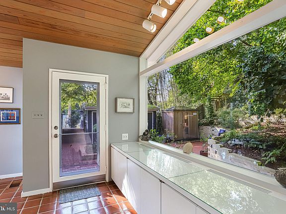 Tucked into a garden oasis, this 2000SF remodeled Goodman mid-century modern home with two additions has enchanting grounds with established native plantings, meandering paths, various sitting areas, a water feature, sculptures, multiple decks, and patios. The entry level features a den/bedroom with a wood-burning fireplace, built-in storage/entertainment nook, a Murphy bed, a renovated full bathroom, and laundry. Upstairs is an open and airy expanded living room with walls of windows framing lush views. The primary bedroom has been enlarged and includes a sitting area, skylight, and clever built-ins. Down the hall is another bedroom and a beautifully renovated full bath. The kitchen addition has vaulted tongue and groove ceilings and includes oak cabinets, quality stainless steel appliances, granite and butcher block counters, a large breakfast bar, built-in buffet storage, and access to outdoor dining areas. The outdoor spaces are truly magical and include a workshop, garden storage unit, climate-controlled storage area, a sauna, and a studio perched on the hillside with fantastic views of the gardens below. Excellent location within the neighborhood: directly across from Voigt Park and the Hollin Hills bocce ball court, and close proximity to the pool and pickle ball courts.