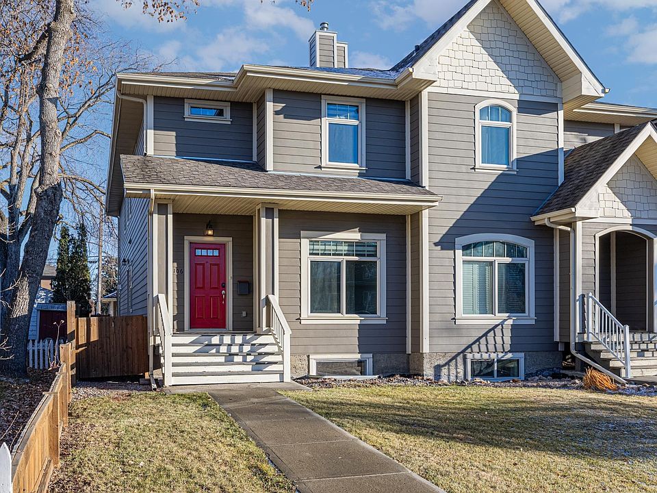 Spacious, well maintained, half duplex with 2 bedroom basement with separate kitchen, laundry and side entrance in the heart of Queen Alexandra! Walking distance to schools, parks, Whyte Ave and UofA! 2100 square feet above ground with 9’ ceilings and Hardwood on main floor, plus main floor office/den. Other perks include a large open concept kitchen/dining and living room with a gas fireplace and oversized east facing windows. Upstairs you'll find a large primary bedroom with a 4 piece ensuite, and a walk-in closet, plus 2 additional bedrooms, 4 piece bath with soaker tub and laundry room! This well maintained home has new carpets and paint throughout, central A/C and a high efficiency furnace, complimented by quality Hardy Board siding! The East facing backyard offers a 200 square foot deck, mature trees, a well built fence and plenty of private yard space with a paved walkway to the Double car garage. This is a turn key home, close to amenities in a fantastic neighborhood!