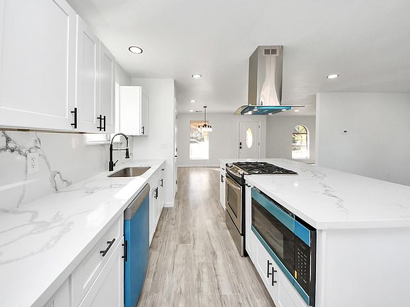 Recessed lightingNew flooringStainless steel appliancesQuartz countersModern open-concept designFreestanding tubGourmet kitchen