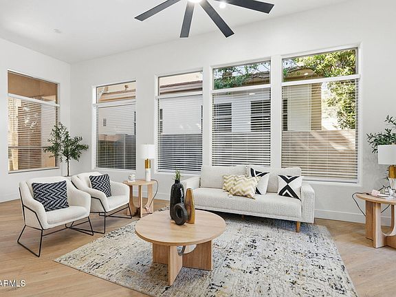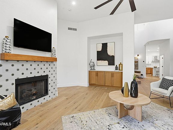 This stunning contemporary remodel blends modern design with Scottsdale comfort and convenience. Soaring ceilings, wide-plank wood flooring, and sleek designer finishes create an open, airy atmosphere throughout. The gourmet kitchen shines with quartz countertops, two-tone cabinetry, stainless steel appliances, and a spacious island perfect for entertaining. The great room features a beautiful tiled fireplace and large sliders opening to a private, peaceful backyard complete with a built-in BBQ, lush greenery, and a tranquil water feature. The primary suite offers backyard access, a sitting area, and a spa-like bathroom with dual vanities, a walk-in shower, and a custom closet. Additional highlights include a brand-new roof with a 10-year warranty, brand-new HVAC system, stylishly updated bathrooms, a dedicated laundry room, and a 2-car garage with built-in cabinets. Impeccably finished and move-in ready, this home delivers easy luxury living just minutes from top dining, golf, and shopping in Scottsdale!