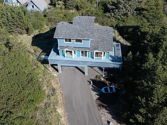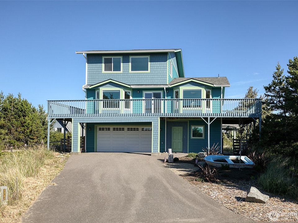 New siding and new roof (2022) on this freshly painted 2.5 story home with tasteful architecture and ocean views. Second level main living area features 2 bedrooms, full bath, and an open floor plan with dining area and built in window seat by the propane fireplace insert. A sliding glass door leads to a large wrap around deck. Lower level accessible through double garage, side door, or front and includes living area, mud room/laundry, ¾ bath, and an office/flex space. Top floor features oversized primary bedroom, large windows overlooking the ocean, and a full bath with a jetted tub and separate shower. Attractive low-maintenance landscaping and fully fenced back yard. Quiet cul-de-sac one block from the public beach trail.