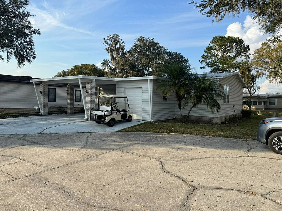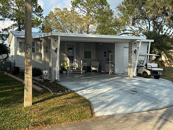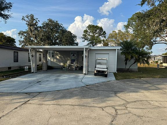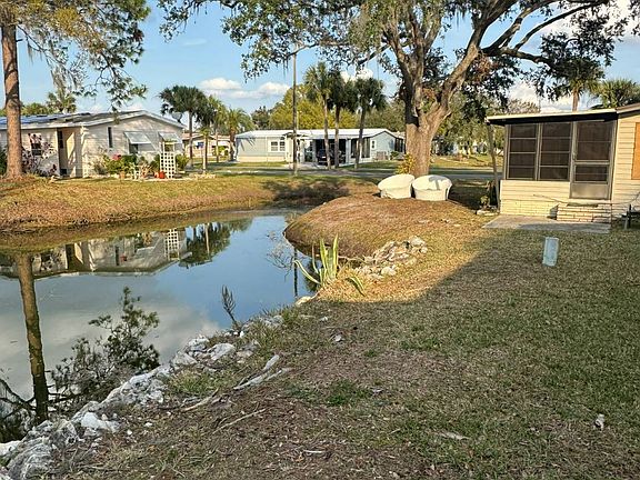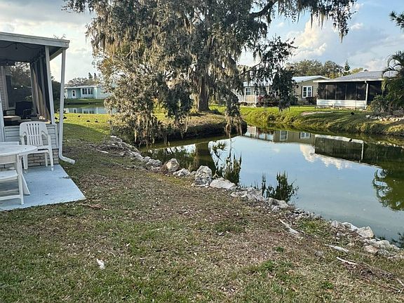 How would you like a cute home on a quiet cul-du-sac with awesome water views and great neighbors in an active 55+ community? This home is priced to move quickly as the current owner bought a larger home just down the street and needs to get packing. As you enter this home, you are greeted with the open floorplan consisting of a Great Room, Dining Nook and Kitchen. These rooms all have drywall and textured finishes providing a contemporary look. The kitchen has modern white cabinets with laminate countertop and a tile backsplash. Most of the appliances are newer vintage from 2021-2024. There is an abundance of cabinets and counterspace along with a convenient eating bar that can easily accommodate 2-4 hungry diners. The adjacent Great Room is spacious and can handle 2 sofas or a sectional and a large screen TV. The Great Room flows into the adjacent screened porch that provides amazing views of the waterway behind the home. You will enjoy many breezy Florida mornings and evenings watching all the birds and critters while indulging in your favorite hobby, beverage or snacks. The home comes with two large bedrooms, both with large closets. To finish things off, this home has a brand-new low maintenance metal roof and carport capable of accommodating two cars. The home does include the pictured golf cart which has 3-year old batteries. The is also a large, attached shed with garage door for your golf cart and washer a dryer purchased in 2022 and 2024. This home is price to sell at $34,777 with a monthly lot lease of a $1,075 which covers your water, trash, sewer charges, taxes plus all of the amenities at your access except for golfing privileges which can be purchased for a surprisingly low annual fee.This home is located in The Meadows @ CountryWoods, a 55+ Community, a PET FRIENDLY community for our fur babies, it also offering an 18/27 hole golf course with many leagues and a friendly Pro Shop, 2 Tennis Courts and Tennis League, billiard room, Shuffle Board Courts, an exciting pickleball group of players, miniature golf, 2 Clubhouses, 2 Swimming Pools, Sauna, Excercise/Workout Gym and Hot Tub Spa. The Meadows also offers numerous social activities including community events such as dances, movie nights, bingo, occasional breakfast and dinners each about twice a month, etc. In addition, we have a non-denominational worship service in our main Clubhouse Sunday mornings and regarding ongoig health needs, our new Baycare South Florida Baptist Plant City Hospital is just a mile the road. This home is priced to sell, call for IMMEDIATE SHOWING to see this new on the market home now.