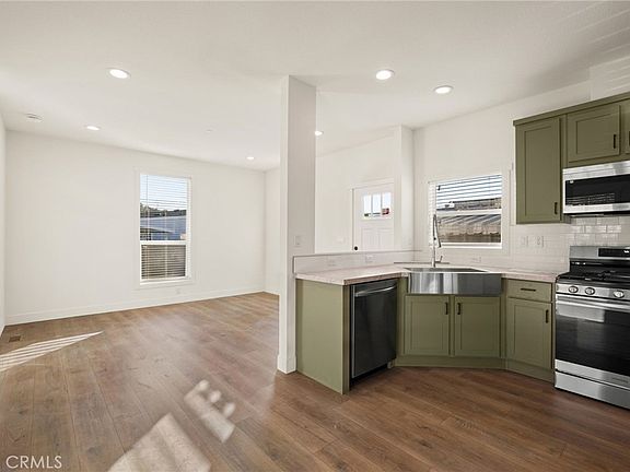 The kitchen features elegant green cabinetry, stainless steel appliances, and a farmhouse sink, creating a modern yet inviting atmosphere. Matte black finishes throughout the home add a stylish, contemporary touch. Additional highlights include an indoor laundry area with extra storage cabinets and hookups, and a primary bedroom with a walk-in closet.