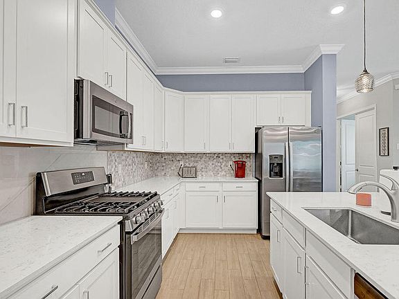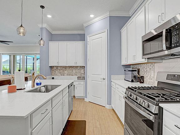 Beautiful lakefront 3/3 home w/office in the vibrant 55+ gated community of Veranda Preserve. This open floorplan offers 9-foot ceilings, plank tile flooring throughout, crown molding, ceiling fans & IMPACT glass. Enjoy the gourmet kitchen with S/S appliances, GAS range and large bar top island w/quartz countertops & backsplash, large dining area & family room w/a mounted 75'' TV that conveys. The primary suite offers views of the lake, master bath has dual sinks and accessible walk-in shower. Relax on your extended covered lanai w/ gas hook-up for your grill overlooking the sunset on the water. Resort style clubhouse offers a heated pool/spa, cafe, fitness room, movie theater, card room, tennis, pickleball and monthly planned activities. Awesome location near the FL Turnpike and I-95