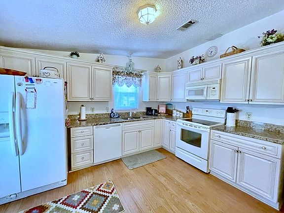 The fully equipped kitchen offers granite countertops, white appliances, and light-colored cabinetry, creating a bright and airy space that's both functional and stylish.