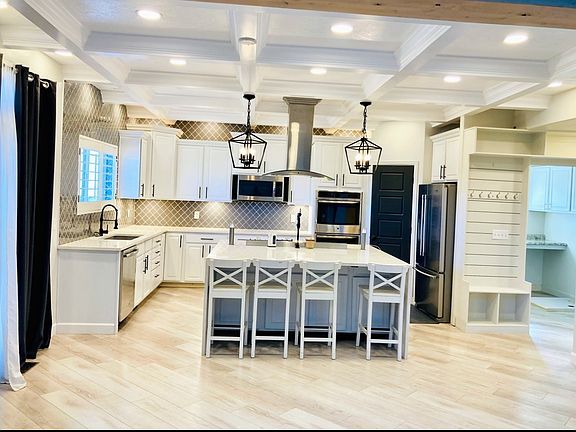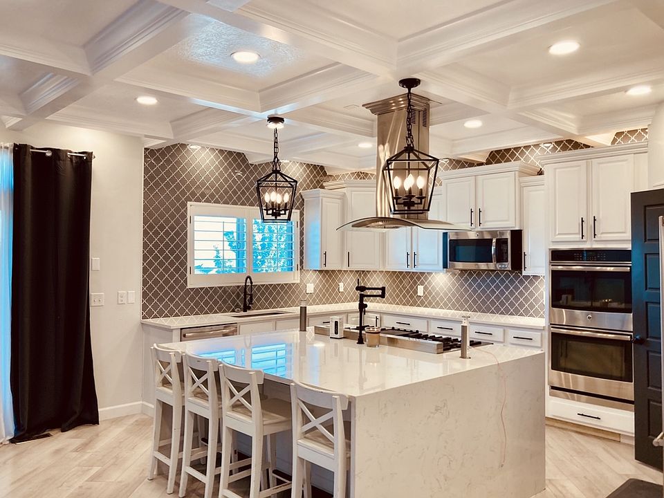 Massive waterfall islandBuilt-in cabinets and drawersMarble fireplacePlantation shuttersCoffer ceilingsSignature appliances