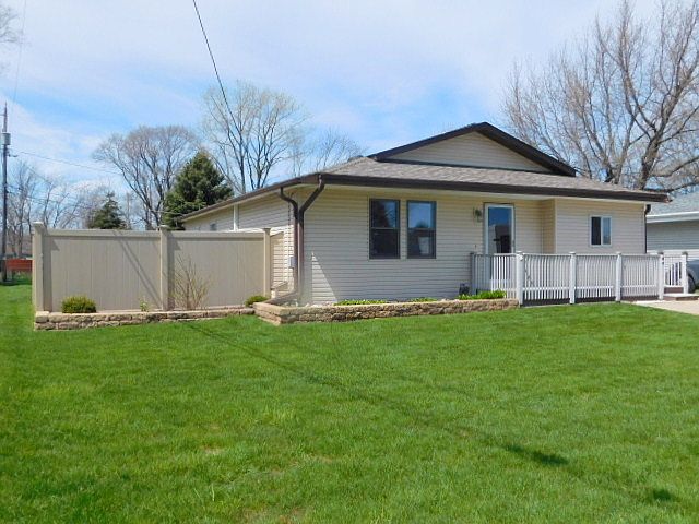 Stairless Ranch 3 Bedrooms 1435 sq ft Near Lake Michigan Eat in Kitchen 15x11 features plenty of cabinets and counter space. Very spacious bath 9 x 9 updated in 2014, double vanity with Kohler forte fixtures, custom cabinetry, deep soaker tub, separate shower stall. Master bedroom 19 10 has large walk in closet with closet organizer, second closet with hard wood sliding doors. Ceiling fan with remote. Bedroom #2 15x10 closet with wood sliding doors & ceiling fan with remote. Bedroom #3 14x9closet with wood sliding doors and metal closet organizer, ceiling fan. Living room 19x10 Brazilian hardwood floors, & 2 ceiling fans, attached covered wood deck off living room with sliding patio doors and cement slab/on back of house. 26x30 Garage has 200 AMP serv & large attic storage above