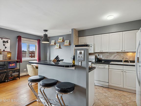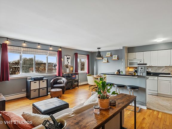 Sunny Top Floor Unit with great open views and tons of natural light! This large 1 BR condo has a wonderful open floor plan perfect for entertaining. Kitchen has tons of cabinetry and counter space, an island with bar seating and the adjoining dining area could also be used as an in-home office space if so desired. Great storage throughout including the very spacious primary bedroom. Newer windows and hardwood floors. Assigned parking on site (must sign up with building to get a space). All this in an elevator building across from wonderful Pottawattomie Park with 9.4 acres of open space and fieldhouse with fitness center, racquetball court, gymnasium, kitchen, and four club rooms. Just 4.5 blocks from the Red, Purple & Yellow Line "L" stops, 5.5 blocks from the Rogers Park Metra Line and only 3 blocks to Jewel Osco Grocery Store and a plethora of restaurants and cafes. Only a short distance to Loyola and Northwestern Universities and the Lakefront as well. Cats are okay but sorry Fido, no dogs are allowed in this building.