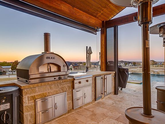 The backyard is designed for year-round enjoyment with a heated and chilled pool and an outdoor living experience inspired by Texas Hill Country resorts. The covered patio is enhanced with automated shades that partially enclose the space, infrared heaters, speaker lights with Alexa integration, and a Big Ass Fans ceiling fan, creating a comfortable backdrop for entertaining or quiet evenings at home. Enjoy beautiful Texas sunsets from your own private retreat.