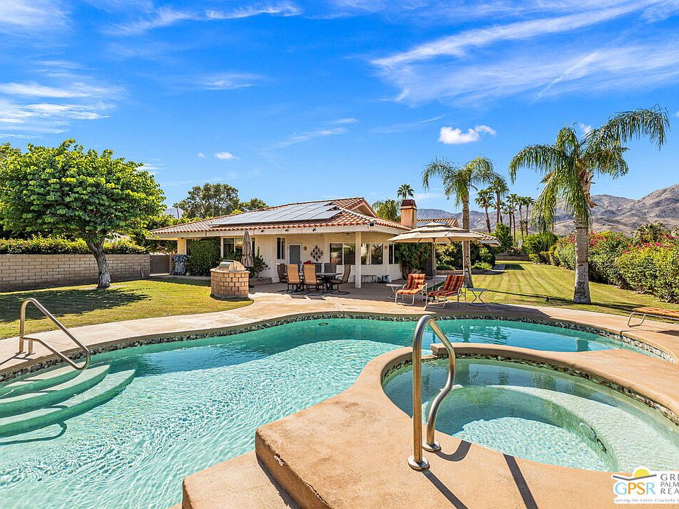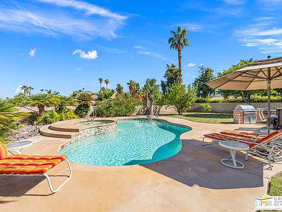 Opportunity meets lifestyle in this well-maintained 3 bed + Den/Executive Office, 3.5 bath residence in coveted South Palm Desert. Set on just over half an acre, this nearly 4,300 sq ft home offers generous indoor/outdoor living, multiple gathering spaces, and park-like grounds with dramatic mountain views. A formal entry welcomes you into sun-filled living and dining rooms, each with vaulted ceilings and a shared two-sided fireplace. Views, too! The adjacent kitchen, complete with a detached island, abundant storage, and seamless connection to casual dining and the large family room, creates an ideal hub for entertaining! The soaring ceilings, wet bar with Scotsman icemaker, and gas fireplace blend comfort and convenience. Step outside to a resort-style setting with a built-in barbecue and a sparkling pool and spa. Whether hosting intimate dinners or larger celebrations, this outdoor environment is designed for effortless enjoyment! A whole-home surround-sound system further elevates both interior and exterior living spaces. The Primary Ensuite is a retreat of its own, offering direct patio access, a large walk-in closet, and a spa-inspired bath with dual showerheads, oversized steam shower, jacuzzi tub, and private outdoor area. Two Junior Ensuites each provide their own bathroom, walk-in closet, and outdoor connection. Skylights in the hallways bring in natural light, while built-in cabinetry adds excellent storage. Additional highlights include a bonus room lined with cabinetry perfect as a craft room, hobby studio, or additional storage plus a separate south-facing Executive Office with built-ins. A spacious utility room connects to the 3-car garage. OWNED SOLAR adds substantial energy efficiency and long-term savings. Located minutes from the best of South Palm Desert and El Paseo, the property also offers ample room to add an ADU.