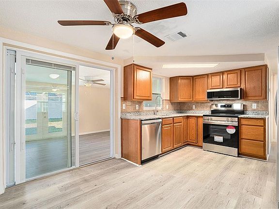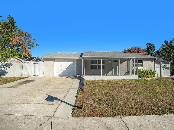 One or more photo(s) has been virtually staged. Your new home features brand-NEW kitchen appliances, NEW granite countertops, and NEW modern flooring throughout. NEW windows, doors, and ceiling fans for added comfort and has also been freshly painted inside and out. This move-in ready two bedroom, 1.5 bath home is in the Regency Park area of Port Richey -- just minutes from waterfront parks, shopping, and dining. NEW windows, doors, and ceiling fans for added comfort and has also been freshly painted inside and out. AND, enjoy a large flexible BONUS room approx 240 SQUARE FEET of 'heated' space for a home office, gym, guest or entertaining space. This beautiful home also has a screened front porch, a FENCED backyard with SHED, as well as a large metal covered pad. The OVERSIZED GARAGE adds extra storage or workshop space. ROOF was replaced in 2021 and A/C in 2018. Conveniently located near Werner-Boyce Salt Springs State Park, 5.5 miles from Bayonet Point Hospital, and US-19 and Little Road for easy commuting.