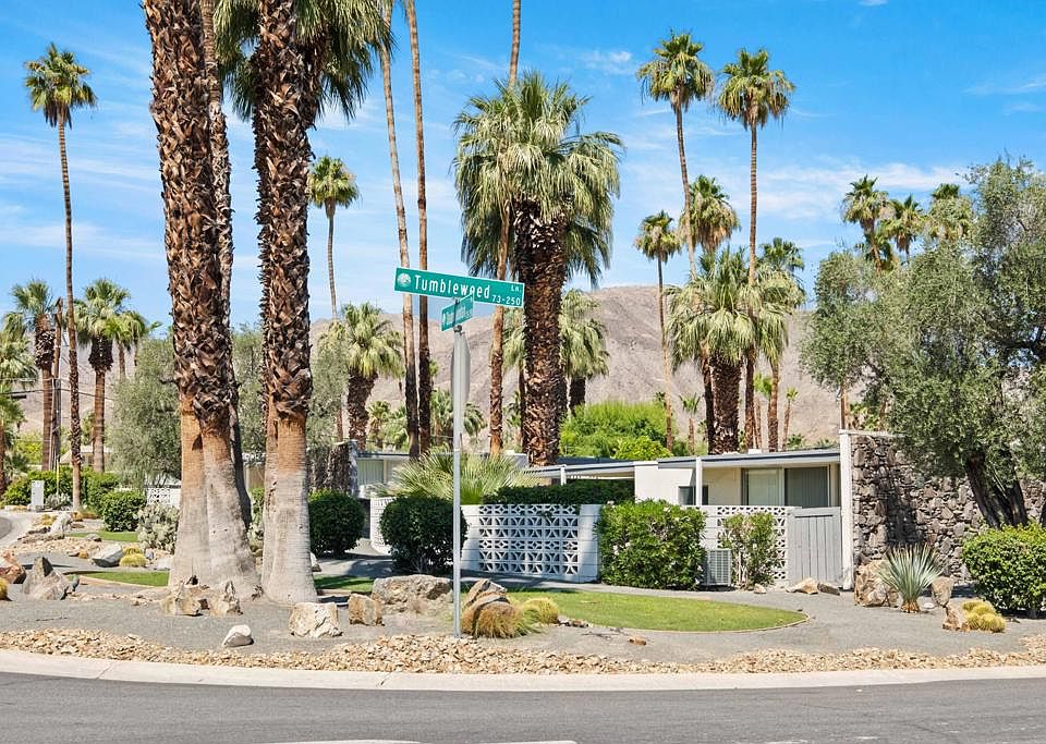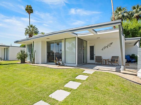 ADORABLE MID-CENTURY MODERN GETAWAY. Great for full time living or just a relaxing weekend. EXCELLENT LOCATION! Walkable to all the action on El Paseo. Shopping, restaurants, entertainment and much more. This two bedroom/two bath over looks the beautiful community pool. It includes unique views of the mountains. There is a single car garage. The laundry is inside the unit. All this is setting in a serene and quiet setting. Great investment property! Come take a look..... you will not be disappointed.