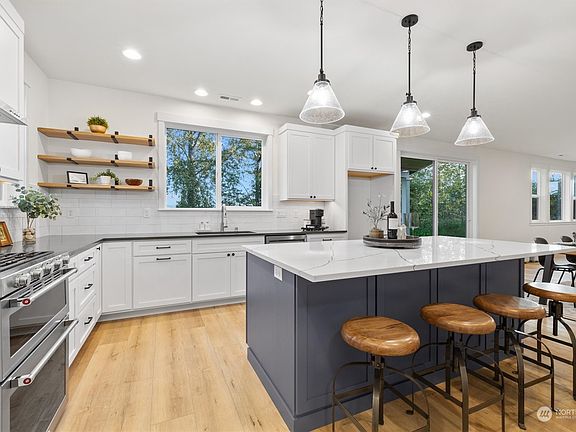 Embrace all the beauty while cooking in your large kitchen w/ custom cabinetry, quartz counters, stainless steel KitchenAid appliances & large walk-in pantry. Oversized glass doors seamlessly transition to the covered Trex deck where you can enjoy all Washington seasons. When things get chilly, warm up next to your gas fireplace in open concept kitchen & living. The rest of the main offers a den & large laundry. Leading upstairs; 3 beds, a full bath & primary suite. PS is a dream complete w/ 5-piece bath & huge walk-in closet. Don’t worry about warmth w/ a high efficiency heat pump/ac & smart water heater w/ continuous hot water. Plenty of parking w/ a 3-car garage, EV charging. Sitting on just over an acre - this home has room for a shop!