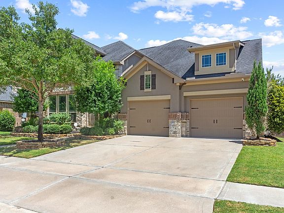 Luxury awaits at 7323 Settlers Way! This stunning 2-story Trendmaker home in Cane Island’s Gated section offers 3,874 sqft on an oversized 11,278 sqft lot with no back neighbors. Features include 4 beds, 3.5 baths, a study, gameroom, media room, and an extended covered patio with pergola and recently added stone extensions. The elegant stone & stucco exterior opens to a dramatic double-door entry and sweeping staircase. Inside, enjoy hardwood floors, soaring ceilings, and a floor-to-ceiling stone fireplace. The chef’s kitchen boasts a wrap-around island, granite counters, stainless steel appliances, and double ovens. The spacious primary suite includes two large walk-in closets and a spa-like bath. Media room includes projector, screen, audio system, console, and theater seating. The jacuzzi is included, along with a high-res security camera system, smart doorbell and entry, and a garage with upgraded flooring. Zoned to award-winning Katy ISD!