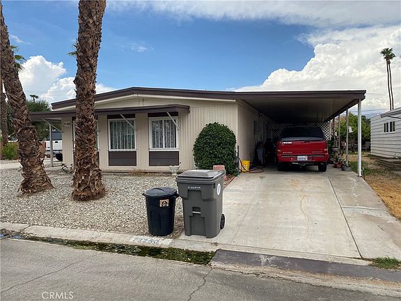 This home is a great corner location with extra long driveway which also has a covered carport, large 12 x 16 shed and beautiful mountain views that makes this 2 bd., 2 ba. home very desirable. You own the land, no space rent or land lease. This home has lots to offer for a very affordable price. Plus, your monthly maintenance fee includes golf for two owners on the deed, swimming pools, hot tubs, tennis courts, pickle ball, shuffleboard, numerous social clubs and activities and a Clubhouse. A 55+ community that is centrally located near shopping, casinos, restaurants and medical facilities and only minutes to the Palm Springs Airport And Casino.