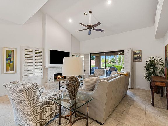 Located poolside with mountain and fairway views, this home is the perfect retreat to enjoy the desert sunshine outdoors by day and relax indoors by the cozy fireplace at night.