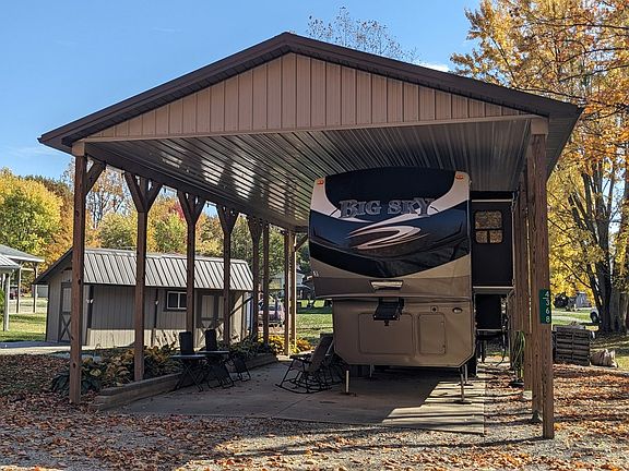 Everything you could want for the perfect seasonal getaway! 2013 Montana Big Sky 5th wheel 40', 26x48 roof-over with 24'x54' slab: 13'4'' height. 10'x20' storage building with electric, fridge and freezer. Also, concrete patio with firepit. All water and electric updated with underground lines, in 2017. French drain installed in front of property for proper drainage. Includes all amenities of Candlewood Lake.