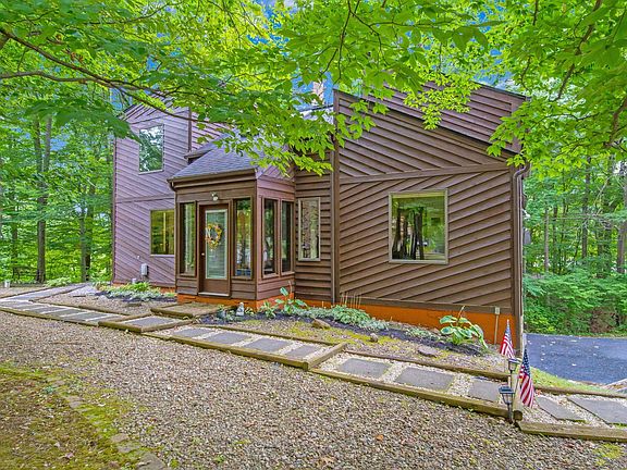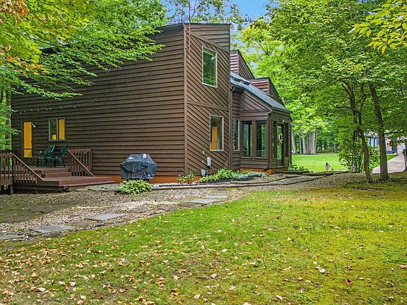 Lakefront home in a wooded, park-like setting! Situated at the end of a quiet, secluded cove on 3 lots and 1.25 acres, this home features a 2-story living room with large, floor to ceiling stone fireplace as the centerpiece, and a full kitchen and dinette. A half bath and two bedrooms, currently used as additional living space and an office, are also on the first floor. A dramatic open staircase leads upstairs to the master bedroom, full bath, and additional bedroom. Downstairs is a full basement and a 2-1/2 car garage. Outside, the deck overlooks large trees and the quiet cove below, with two boat docks. Property also includes a large, detached garage and storage building. Sip your morning coffee enjoying the shaded lake cove and wildlife! House is sold as is. Enjoy the amenities of CWL!