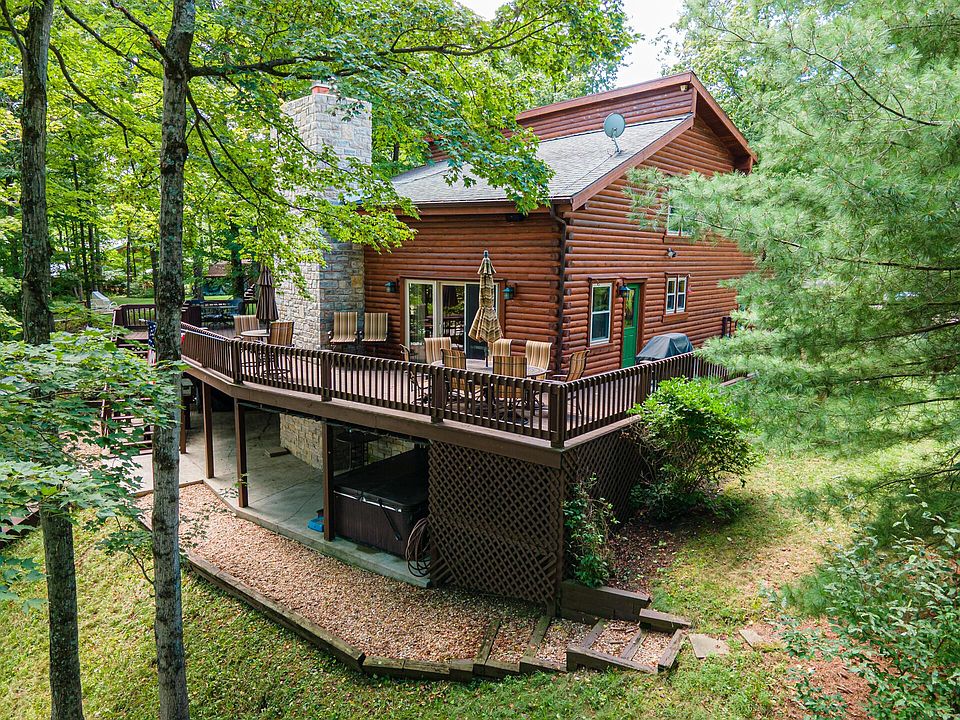 Premier lakefront log homeSecond-floor loftCovered boat slipsOpen conceptOpen concept family roomWrap-around deckPaved golf cart path