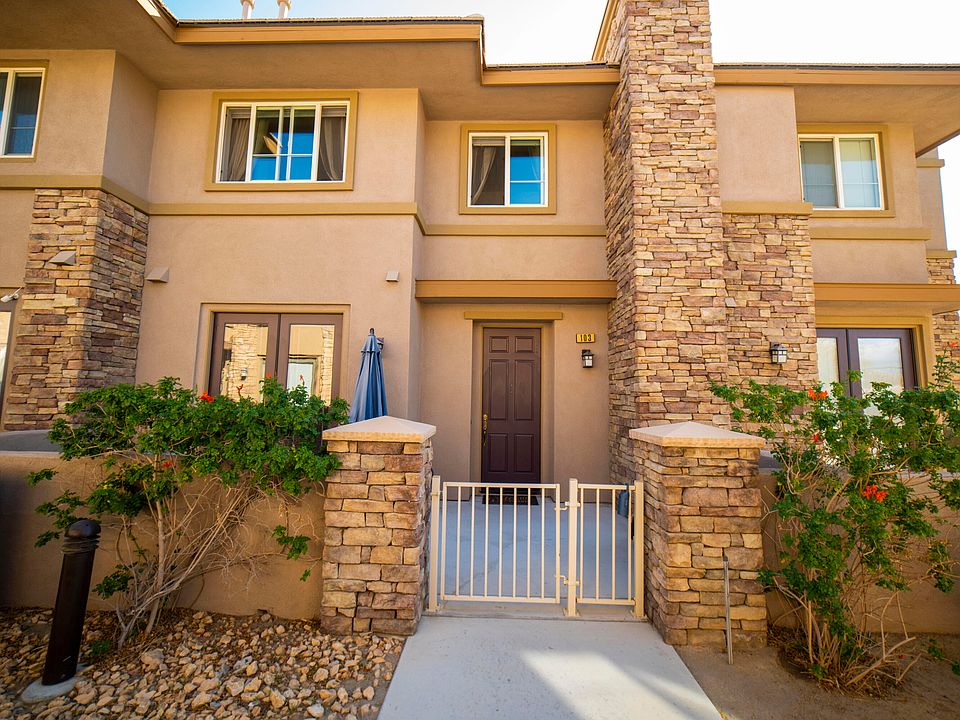 This beautifully maintained 2 BR/3Bath, 1,240 sq ft, townhouse in Monterey Ridge features a beautiful resort-style pool & spa, clubhouse, playground, low HOA dues of $217, new carpets, laundry room and an attached 2 car garage. Upon entering the first floor you will find yourself in the foyer followed by the guest bedroom which features French doors that lead out to a west facing patio and an attached large en-suite bathroom. Followed by a laundry room where the attached garage entrance is located. Upstairs you'll find an open floor plan style kitchen perfect for entertaining as it includes a large granite island, cherry cabinets and stainless steel appliances; The living room which showcases a gas fireplace, recessed area for a tv and custom display shelving. The Master bedroom is also located upstairs and it Includes a walk-in closet and a bath with double vanity, a soaking tub, and a separate water closet. Conveniently located in North Palm Desert close to shopping, I-10, and the Cal State San Bernardino - Palm Desert Campus. Close to Hospital, Markets, and Shopping center. You won't want to miss this rarely on-the-market gem!