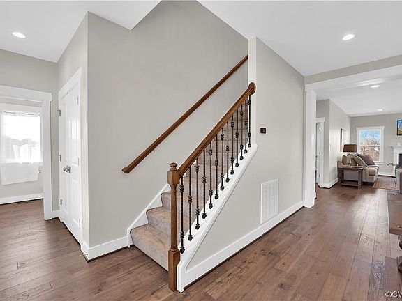 You are going to LOVE this 4 bed, 3.5 bath, 2,662 sq ft home with a 2 car garage in the sought after Appomattox Trace neighborhood of Powhatan County! This newer home features a 1st floor primary suite, double vanities, walk-in closets, beautiful hardwood flooring, an open concept floor plan and so much more! As you enter the home you're greeted by the handsome hardwood flooring throughout, the open and airy living room and kitchen floor plan, recessed lighting, a gas log fireplace with mantle, and tons of natural lighting pouring in. The eat-in kitchen has granite countertops, a walk-in pantry with wood shelving, white true-wood soft close custom cabinets, an island with tons of cabinet storage space & stylish pendant light fixtures, Frigidaire Gallery series stainless appliances, and subway tile backsplash. Open from the kitchen is a large dining space overlooking the expansive backyard. The primary suite on the first floor features hardwood flooring, a modern ceiling fan & recessed lighting, luxury en-suite bath with a frameless glass door along the 6x4ft tiled shower with bench, and double vanity with granite countertops that lead to the massive primary walk-in closet. Downstairs also has a half bath and the dedicated laundry/mud room with tiled flooring. Upstairs there is a carpeted loft space versatile for a home office or media room, 3 generously sized bedrooms, and 2 full bathrooms. All rooms offer recessed lighting and are pre-wired for ceiling fans if needed. The backyard showcases a concrete patio perfect for entertaining, a split rail fence and tons of usable yard space for activities. With low maintenance vinyl siding, vinyl energy efficient windows, 30 year dimensional shingled roof and freshly stained decks this is a low maintenance turn key home!