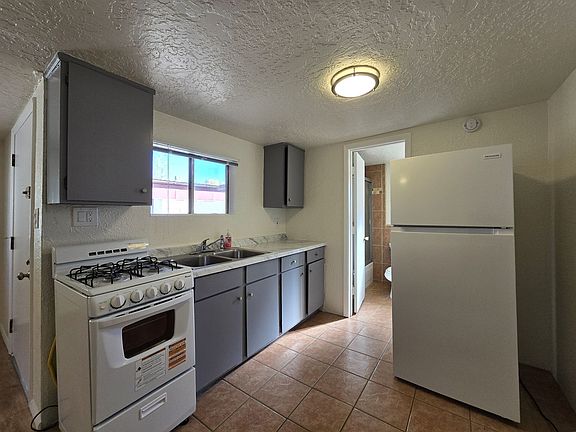 The kitchen is designed for efficiency and aesthetics, featuring sleek gray cabinetry, a durable white gas range, and a full-size refrigerator. In the bathroom, you'll find a contemporary vanity paired with warm brown tilework surrounding the tub and shower, which includes a modern glass enclosure. The spacious bedroom offers excellent closet storage, ensuring everything has its place.