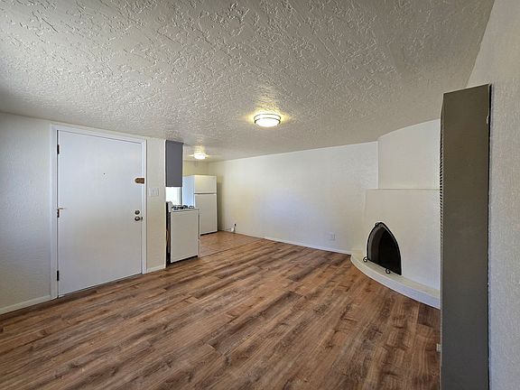The bright, main living area immediately impresses with updated, wood-style plank flooring that extends into the bedroom, creating a cohesive and modern look. A unique focal point of the space is the charming, corner fireplace, perfect for creating a warm and inviting atmosphere on cool evenings.