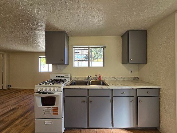Charming corner fireplaceSleek gray cabinetryDurable white gas rangeContemporary vanityModern glass enclosureUpdated finishesLow-maintenance walled-in gravel landscaping