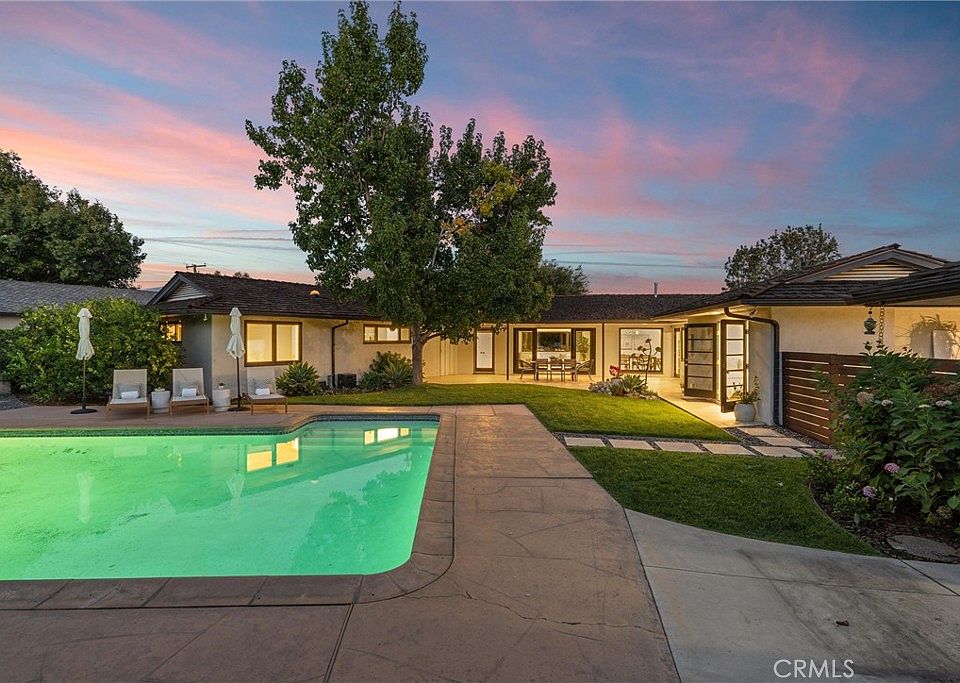 For those who love indoor-outdoor living, the layout is perfection—the living room seamlessly connects to the dining area, kitchen, and a wall of glass that opens to an inviting backyard oasis with a patio, pool, and lush gardens.