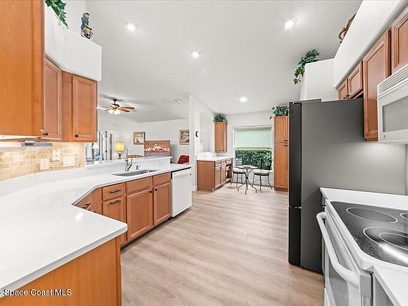 Wake up to serene water views and unwind with a cup of coffee—or a glass of wine—in the expansive sunroom that easily flexes as a fourth bedroom or bonus space. This beautifully maintained home shows pride of ownership at every turn, offering a bright, open layout that makes daily living and entertaining a breeze.The heart of the home is the chef-inspired kitchen, complete with Quartz countertops, a newer Samsung Bespoke French Door refrigerator, new dishwasher, updated faucet, and tons of cabinet space. Luxury plank vinyl flooring flows seamlessly throughout, accented by modern baseboards for a polished look.Enjoy peace of mind with smart upgrades like a Trane HVAC system (2021), accordion hurricane shutters, and approximately $10,000 worth of custom blinds throughout. The freshly painted exterior, upgraded dimmer switches, and an oversized garage—4 feet deeper than standard—add even more appeal. You'll also appreciate the additional attic storage for all your seasonal items. Retreat to the owner's suite featuring an updated shower (2021), Quartz counters, and newer fixtures that elevate your daily routine. Whether you're searching for a low-maintenance second home or embracing carefree Florida living full-time, this home delivers. The HOA takes care of the lawn, so your weekends stay stress-free.Everything you need, nothing you don'tand views that never get old.