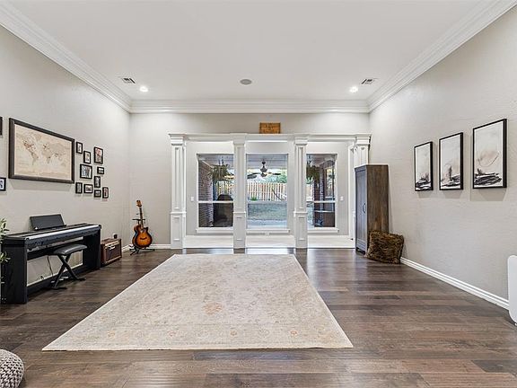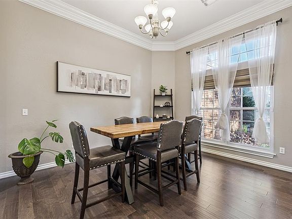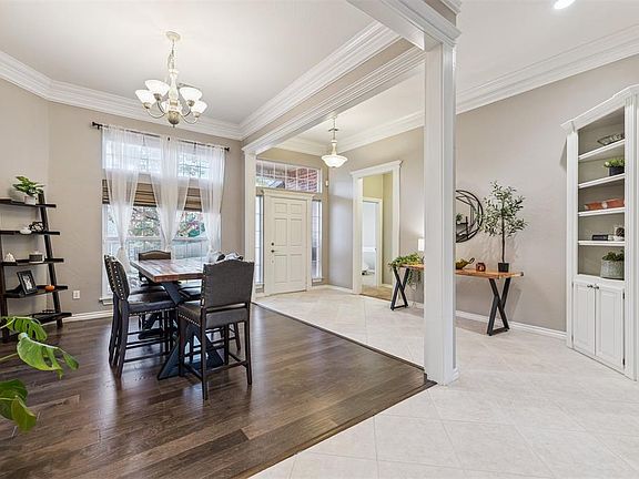 Perfectly situated on a peaceful cul-de-sac street, this stunning home has mature trees and a beautiful covered entry with stone accents. Step into a home designed for comfort and connection. The main living spaces feature rich hardwood floors, elegant crown molding, and expansive windows. A versatile flex room offers endless possibilities — perfect as a music room, formal living area, or home office —accented by stately millwork and a wall of windows overlooking the backyard. The family room is warm and welcoming, anchored by a beautiful stone fireplace and surrounded by built-in cabinetry. The open layout flows seamlessly into the kitchen and breakfast nook areas, making it ideal for entertaining. The inviting kitchen blends rustic charm with modern luxury. Granite countertops, stainless steel appliances, including Thermador double ovens, and a spacious center island. The primary bedroom offers a tray ceiling, crown molding and large windows that overlook the backyard and easily accommodates a king-size bed with additional furniture. The luxurious primary bathroom features dual vanities with beautiful granite countertops and custom wood cabinetry affording ample storage, a spa-like soaking tub and a separate shower. In addition to the four spacious bedrooms, there is also a large upstairs bonus room. Experience the perfect outdoor retreat right in your own backyard featuring an expansive covered patio and a custom pergola with a stone fireplace, built-in grill, sink, and counter space. Enjoy access to a pathway that leads to the back of the school. The neighborhood features walking and jogging trails, a neighborhood pool and two ponds. The home also has a Nuvo sound system, ethernet wiring, touch screen panels, along with pre-wiring for both surround sound and security cameras. Seller reserves the hot tub, kitchen and garage refrigerators, chiller and TVs (brackets will remain).