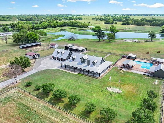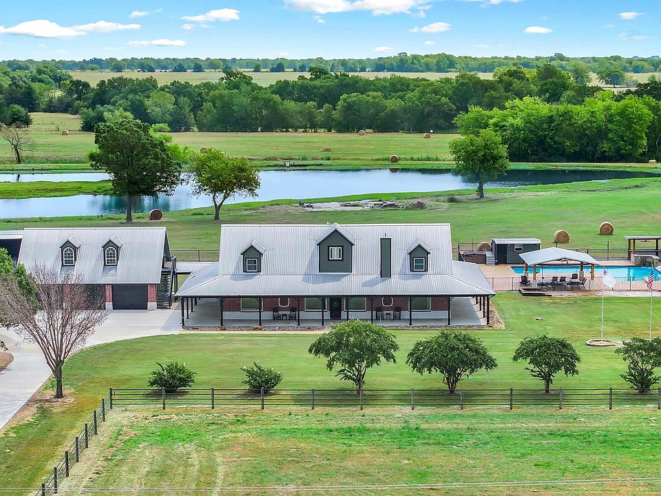 Turnkey Country Showplace! 29+ pristine acres offer gated entry, Ponderosa pipe fencing, stocked lake & pond, new driveway & cross fencing. Stunning, updated 3000 sf home has wrap-around porches, metal roof, 2 X 6 exterior walls, Anderson windows, & solid core foam insulation in attic & walls. Family room has soaring ceiling, floor to ceiling rock fireplace with pellet stove insert & seamlessly flows into fabulous, redesigned chef's kitchen featuring granite countertops, huge island, SS appliances with 2 dishwashers, gas cooking, coffee bar with reverse osmosis pot filler & pantry. Spacious primary en suite has remote window shades, oversized tile shower, double lavatories & walk in closet. Main floor also has great media room & separate office with outdoor access. Gorgeous new stairway railing leads to 3 bedrooms plus Jack & Jill bathroom. Major renovations have been done to the home in 2024 & 2025. Detached 3 car garage has 760 sf guest quarters complete with kitchen & bathroom. An outside oasis awaits you with sparkling saltwater swimming pool (diving board & slide), pool house with loft & bathroom, hot tub with TREX decking, cabana, pavilion, pump house, outdoor shower & tons of seating area. A focal point of the property is the beautiful stocked lake with a lakeside fire pit, pond & shooting range. Multiple outbuildings include two 30 X 15 loafing sheds, tack shed, 4 stall barn, covered RV & vehicle buildings. Property is minutes to Emory & World Famous Lake Fork AND Lake Tawakoni & State Park.