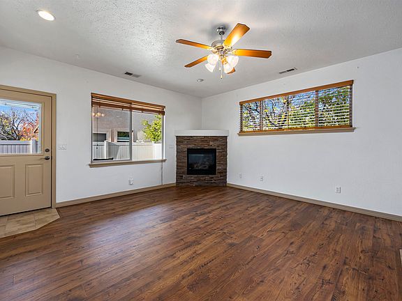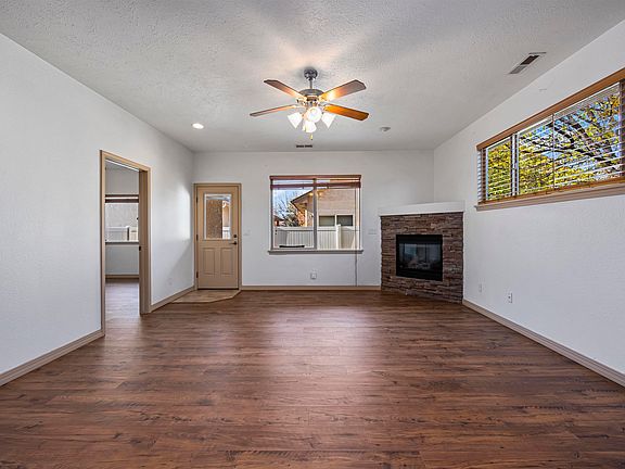 Don’t miss out on this exceptional townhouse in Woodridge Subdivision! This bright and airy open floor plan features 10' ceilings, split bedrooms, two full baths, and a separate laundry room. Enjoy cozy evenings by the gas fireplace in the living room. There is plenty of storage in the kitchen, with tall cabinets & a pantry. The master suite includes a generous walk-in closet, while both bathrooms are adorned with stylish tile showers and flooring. Upgraded wood blinds enhance the appeal of the windows. Step outside to a charming, fenced backyard complete with a covered patio. Located at the end of a cul-de-sac, this unit shares a wall with only one neighbor, giving it a more private feel. Additionally, your kitchen view overlooks a landscaped open area. The oversized one-car garage offers plenty of storage space. This townhouse is a true gem!