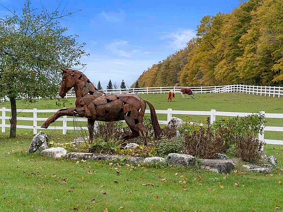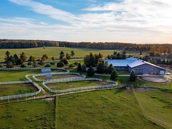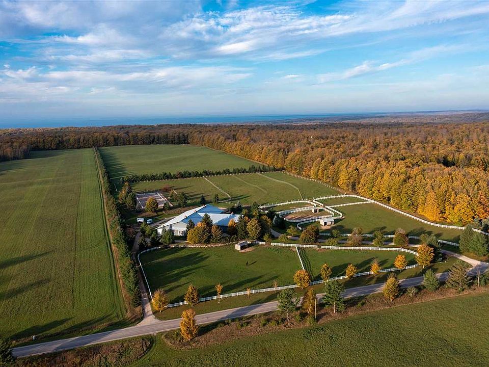Presenting Northern Michigan's premier equine facility. Located just north of Harbor Springs, this estate property is situated on 35 rolling acres, nestled atop of a hill with breathtaking views of nearby Lake Michigan. Only three miles from the Mitten State's famous freshwater beaches, the facility is designed to operate with great efficiency and seamless flow as either a private barn, or a high-end training facility. The indoor arena is 100 feet x 160 feet, and GGT footing was installed in 2019 with a high performance jump blend. The outdoor arena is regulation dressage size, with synthetic footing installed in 2017. Riders and their equestrian friends will prepare, perform and recover in luxury, with custom tack lockers, two matted grooming areas, dedicated feed room with refrigerator for veterinary supplies, lounge with washer and dryer, complete kitchenette, and a full bath. Finer touches include a heated observation room outfitted with high speed WIFI and a spacious blanket room with hooks for each horse to make any wardrobe change seamless. A full hay loft with drop down hatches to the front stalls, and a large hay elevator facilitates efficient hay storage. The back fields are in current hay production and have been reseeded and fertilized. The property is adorned with extensive rock landscaping, retaining walls, garden beds, and blue-stone patios to finish the aesthetic of this one-of-a-kind farm. Sale includes : 15 stall barn, equipment, generator, diesel tank, existing staff (if desired), and 5 developable lots with strategic water views. Ask for complete package or call for your private tour today.