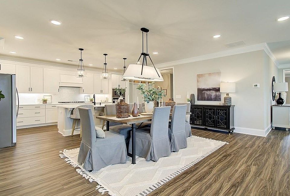 Ranch homeOpen floor planFamily roomDining areaWalk-in closetTiled zero entry showerElegant bathroom
