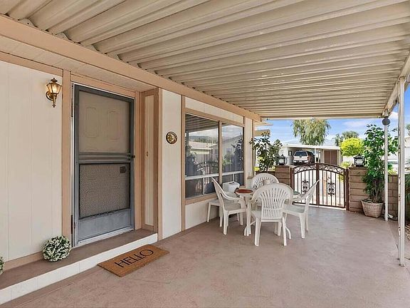 At $229K for a 1979 home which qualifies for financing in PDG where else can you find a home like this? The home is very charming and has been very well maintained. Once you enter thru the homes front gate you will fall in love with the patio which is spacious and has mountain views. The different rosebushes surrounding the patio add an extra special added scent! Upon entering this beautiful home you will find an inviting living room, with space for a dining table. The kitchen has seating for 2 at the counter and has a pantry closet opening from the kitchen and laundry room . From the kitchen you have a comfortable family room with vaulted ceiling and beams. Once in the spacious primary bedroom you will be able to walk onto the patio with your morning coffee. The sliding patio door which flows into the patio is currently hidden by the bed.After loving this home for many years as a snowbird the owners are ready to sell and priced it to sell. Will you be the lucky person to live in this home at a great price? Please come and view it to see for yourself!PDG is a wonderful place to live for the active over 55. With roving security, golf course, putting green, banquet room, spas, swimming pools , restaurant and bar on site what more can you ask for. Easy access to shopping as Home Depot, Costco, and Walmart a re a hop, skip and jump away.!Please note the carpets and home will be professionally cleaned after an accepted offer. All furnishings are included. except for the staging items. Storage shed is also on the property.