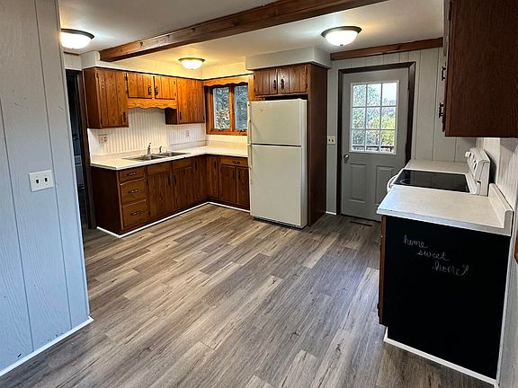 Cozy, barn-style A-frame home with a large wrap around deck, nestled in a serene location just outside of town. Beautiful yard with a fenced in area, perfect for a dog. Affordable 2 bed 1.5 bath house with 24 ft deep, 1 car garage, and a potential 3rd room that could be converted into an extra bedroom, office, or family room.