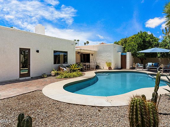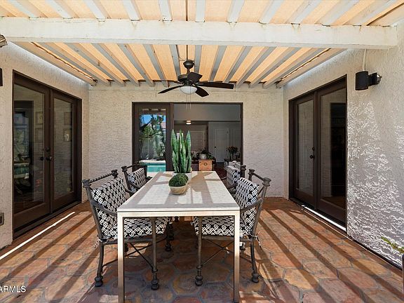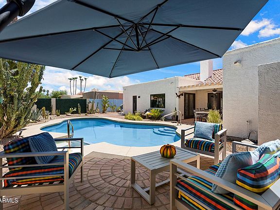 Treasure of a home in a fabulous walkable gated community in Scottsdale! 3 bedroom,2.5 bathroom updated and spacious with pool and low maintenance back yard. Open family, dining, great room area with additional den/office area overlooking pool and backyard. Great lock and leave home! New dishwasher, one 2024 HVAC unit, beautifully appointed primary bath, large primary walk in closet and generously sized rooms make this a wonderful home. Easy living. Tucked away in a quiet area of Scottsdale. Outside the gates are walking/ bike riding paths, Trader Joe's, AJ's, dining- almost everything needed is a short distance. Come see this home! (Home is on leased land. Pls see remarks)