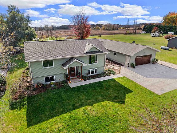 Country living meets luxury w/ dream garage, just 20 minutes from Green Bay! Home was a rebuild to studs in 2023 due to a fire. No expense was spared w/ stunning granite, LVP flooring, gorgeous birch cabinetry & doors. Kitchen is sure to impress w/ granite and eat in island, tiled backsplash, farm sink, induction/convection stove/oven and stainless appl. Patio doors walk out to deck. 2 bedrooms on the main w/ barn style closet doors w/ built in storage. Lower level has daylight windows w/another living area and kitchenette. Spacious laundry, full bath, bedroom and an office or possible 4th bedroom. Garage is nothing less than spectacular w/ full bath, in floor heat, epoxy floors and more living space! Outside is beautifully landscaped and set up for some critters w/ outbuildings and coops