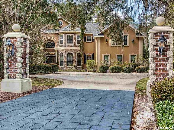 Beautiful private estate in the exclusive Carollton on almost 5 acres. Enter through the stately columns and gate onto the circular drive. The home's interior has travertine flooring, ceiling beams,carved stone FP, finely detailed wood trim & a gourmet chef's dream kitchen that includes top of the line S/S appliances, a walk-thru pantry, a butler pantry and granite. Upstairs, there are two bedrooms, a full bath and large media room/play room. The master suite is downstairs and another fourth bedroom with bathroom is on opposite side of home giving privacy for guests or older adults. Formal living and dining rooms are off the front door as well as a study/5th bedroom. Additional features: hidden TV in the MSTR BA mirror, heated flooring in MSTR BA, central vac, sprinkler system, surround sound. Close to UF Health, University of Florida, NFRMC and I-75.