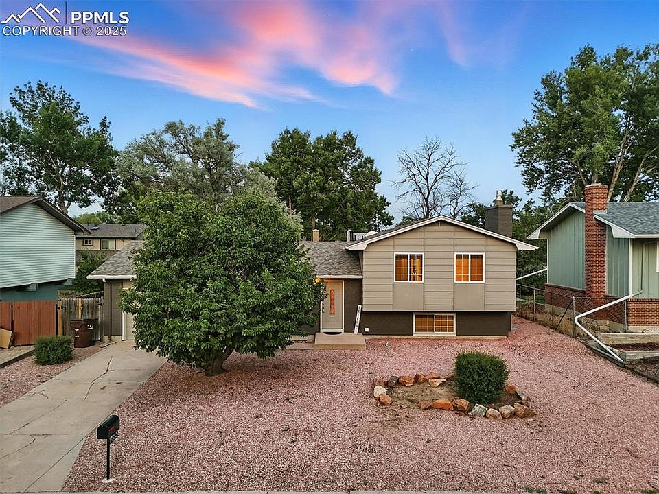 This lovely home is on a quiet, friendly cul-de-sac, low maintenance, xeriscaped front yard, an enormous rear, two-level deck, a handy tankless water heater, is laid out such that the lower level could be used as a fourth bedroom suite and is a short drive to Fort Carson, Fountain Creek Nature Center, and many shopping amenities in the Fountain area and features As you walk into the home, you will find a entry area with a coat closet and a large, inviting living room. Just beyond the living room is the kitchen and dining area. The kitchen has an abundance of cabinets and storage and a window over the sink that allows natural light. The dining area features walk out French doors to the inviting deck. The lower level has a separate family room with gas fireplace and its own bathroom. The lower level could easily be used as a separate fourth bedroom suite. On the upper level, you will find three bedrooms. The primary bedroom has its own master bath and French door walk out to the upper level of the rear deck. There is an additional full bathroom on the upper level for the other two bedrooms to share. On the lower level, you will find the laundry facilities and den with a gas fireplace and attached bathroom, perfect for a separate bedroom / bathroom suite. The backyard has a storage shed and a large two-level deck that is perfect for entertaining!