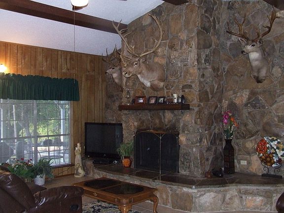 Lakefront home, large rock fireplace nestled away on 4.3 acres. Electric Gate at entrance Covered front & back Patio. Large open kitchen w/ lots of cabinet space. Boat ramp and split dock. 1,100. sq.ft. Metal Building w/concert foundation & Electricity. New Trane A/C system.