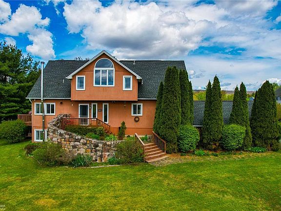 OFFER DEADLINE WED. 6/5 BY 11AM. Beautifully-charming home offering absolutely extraordinary views of the surrounding Northwestern Lehigh natural landscape. Located on a private drive just off of King’s Highway, the property is conveniently located and just a short distance from Leaser Lake, Blue Mountain, and so much more. The home has been lovingly updated and maintained over the years, and the light-filled interior is truly whimsical and unique- this is anything but a cookie-cutter home! The first floor has an open flow to it, highlighted by a vaulted dining area with large geometric windows, adjacent to the living room with its wood-burning fireplace. The kitchen is warm and inviting, with painted cabinets, butcher block countertops, beautiful glass mosaic backsplash, and tremendous exterior views. Two large bedrooms and a full bath round out the first floor. Upstairs is a very special primary suite w/ a Juliette balcony which adjoins a huge loft space flooded with sunlight and interesting architectural angles all around you. Bamboo floors throughout the 1st and 2nd floors. In the lower level of the home is a great recreation room-perfect for entertaining and tv watching, or even a home gym. Playful flooring and finishes throughout- with plenty of windows and even more natural light through the daytime. Half bath, laundry, and a large storage/utility area round this out. Outside is 878 sf of wraparound deck space surrounding above ground pool. HOME WARRANTY!